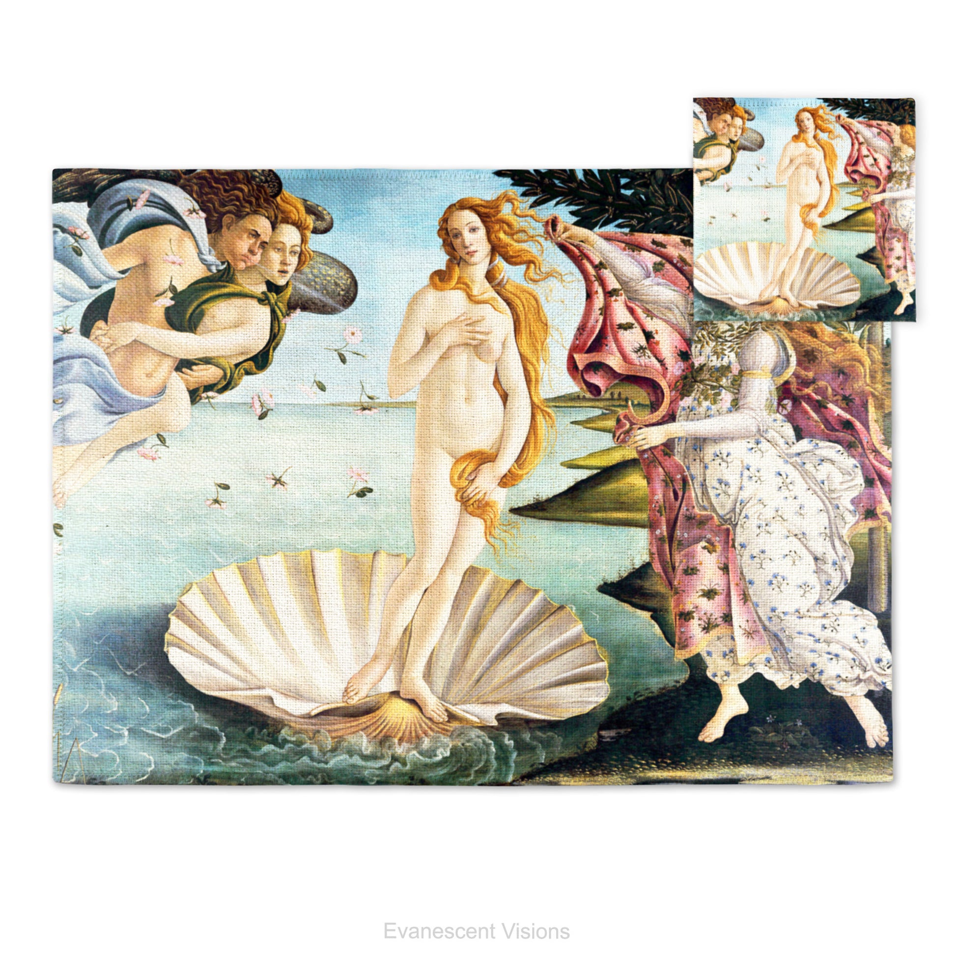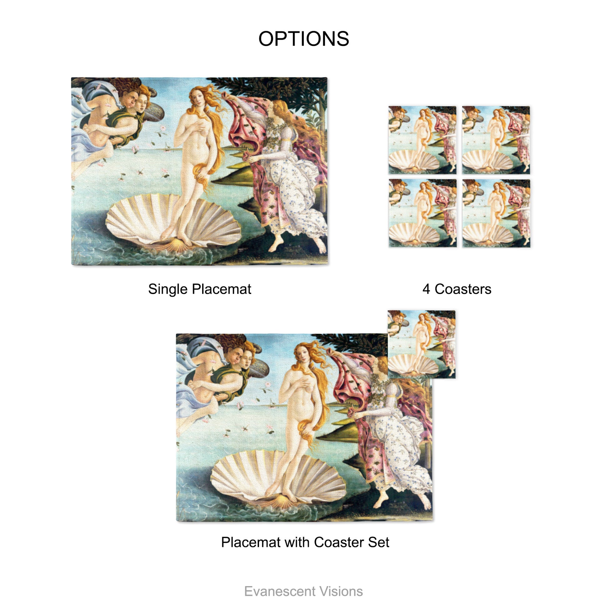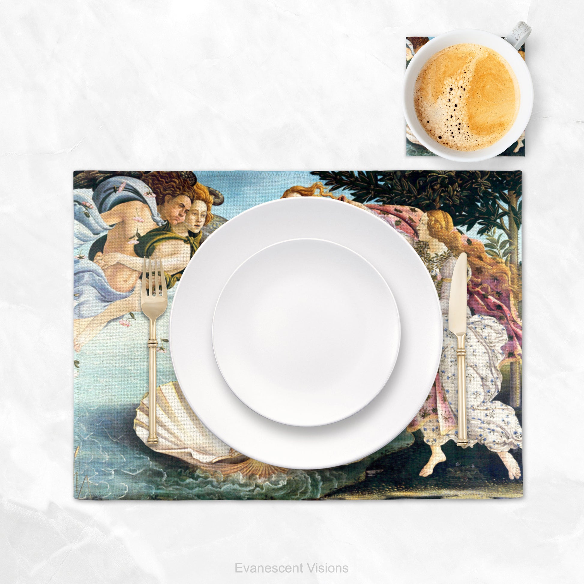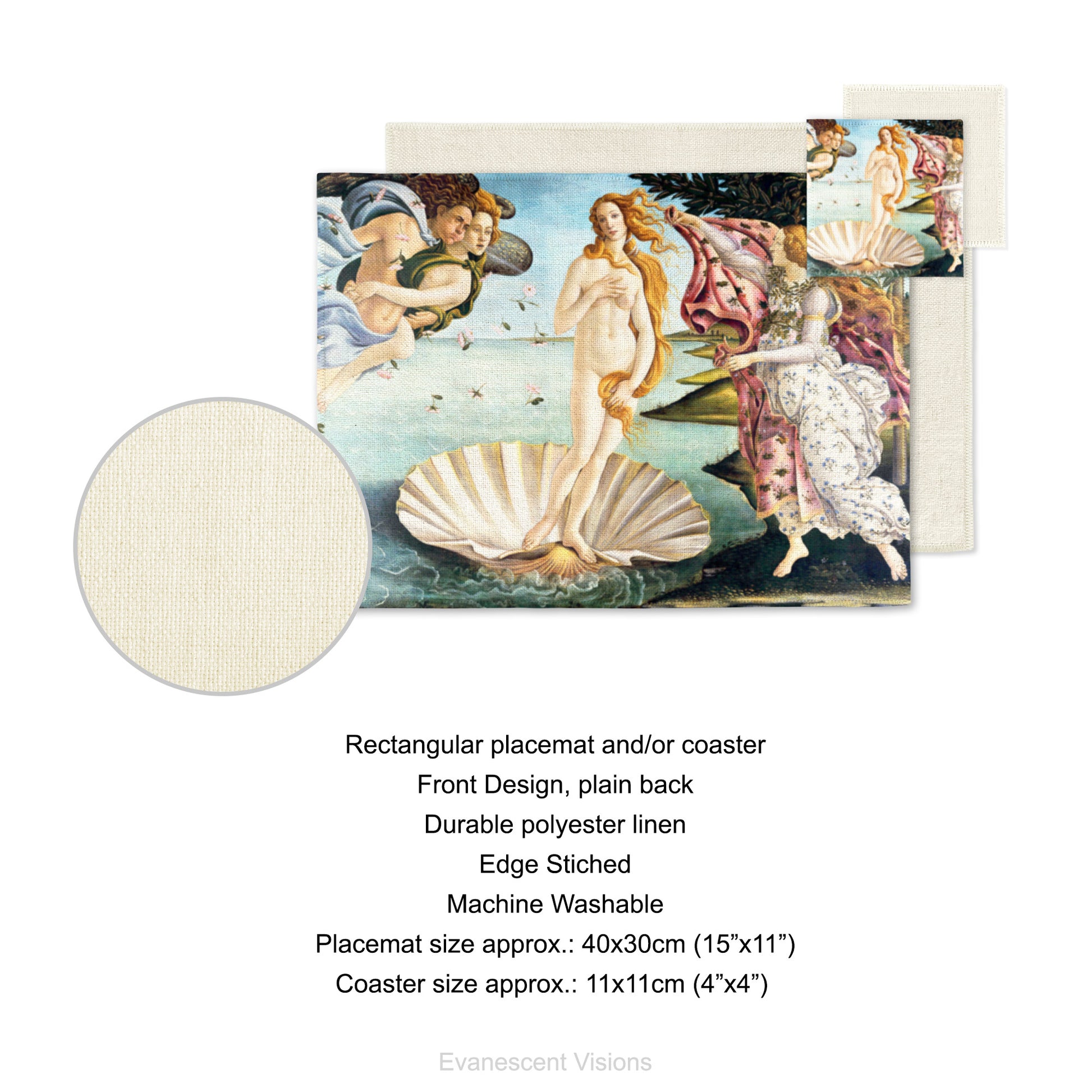 A decorative and durable artistic linen effect placemat and/or coasters. The front side features the artwork 'Birth of Venus' by artist Botticelli. The placemat and coaster are machine washable.