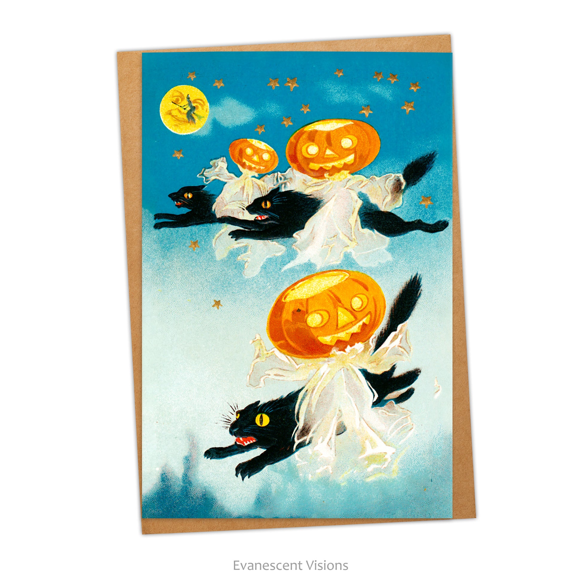 A fun, vintage design Halloween invitation card with flying black cats and Jack O'Lanterns. Your custom event details will be printed inside the card.