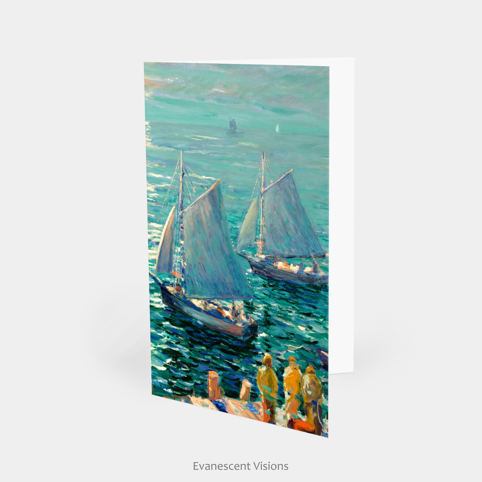 A pack of 10 art notecards with envelopes, with a design that covers both the front and back. On the Wings of the Morning by Jonas Lie (1880-1940) shows a classic fishing boat scene off the New England coastline. The gorgeous aquamarine colours of the sea and sky along with the early morning sun reflecting on the water combine to turn an ordinary scene into a breathtaking one.