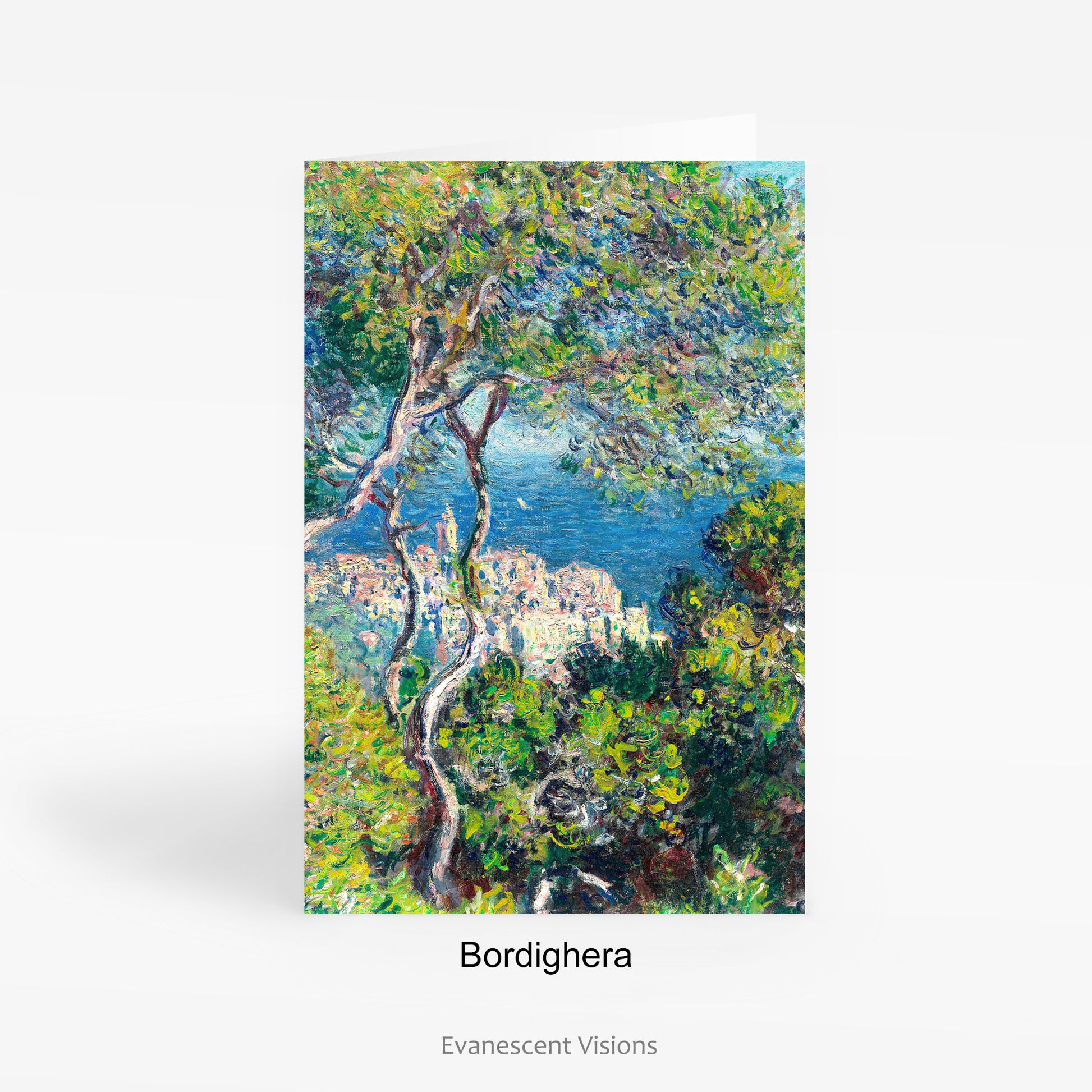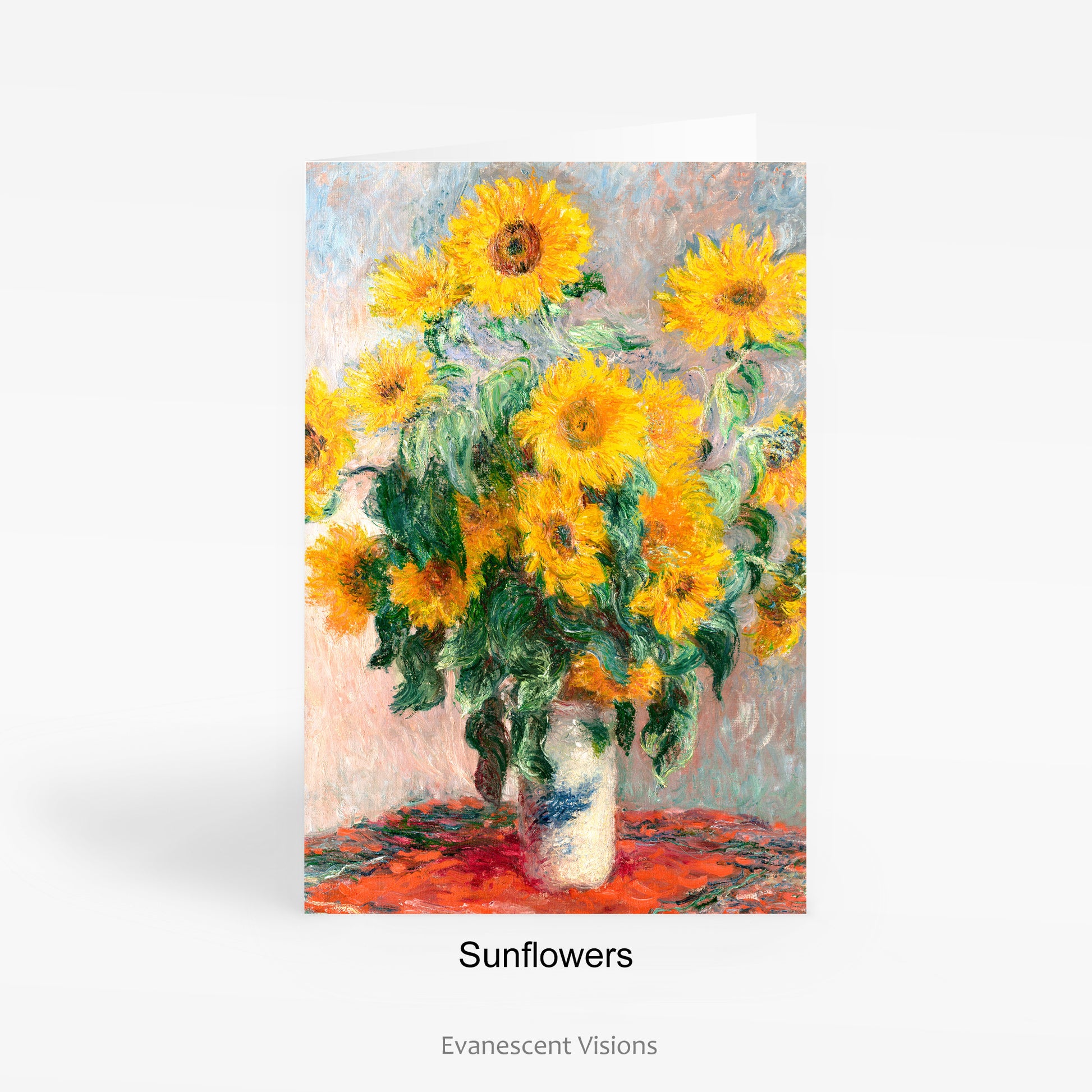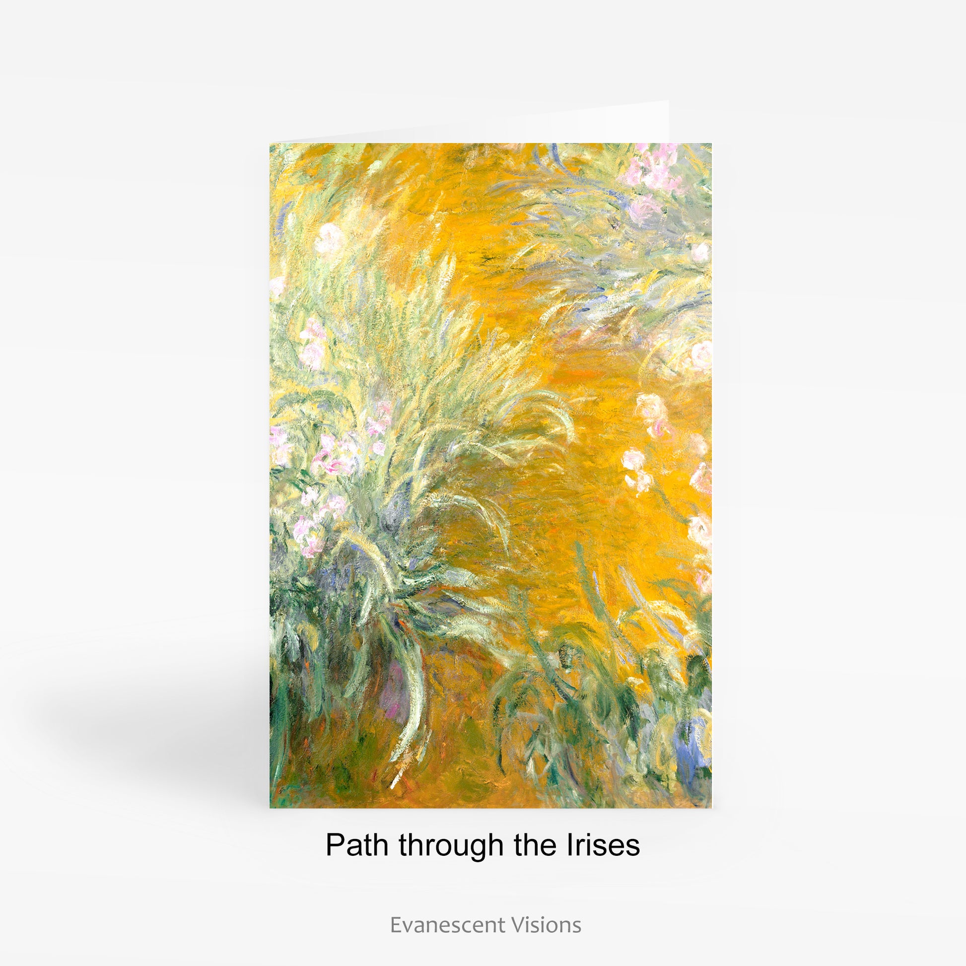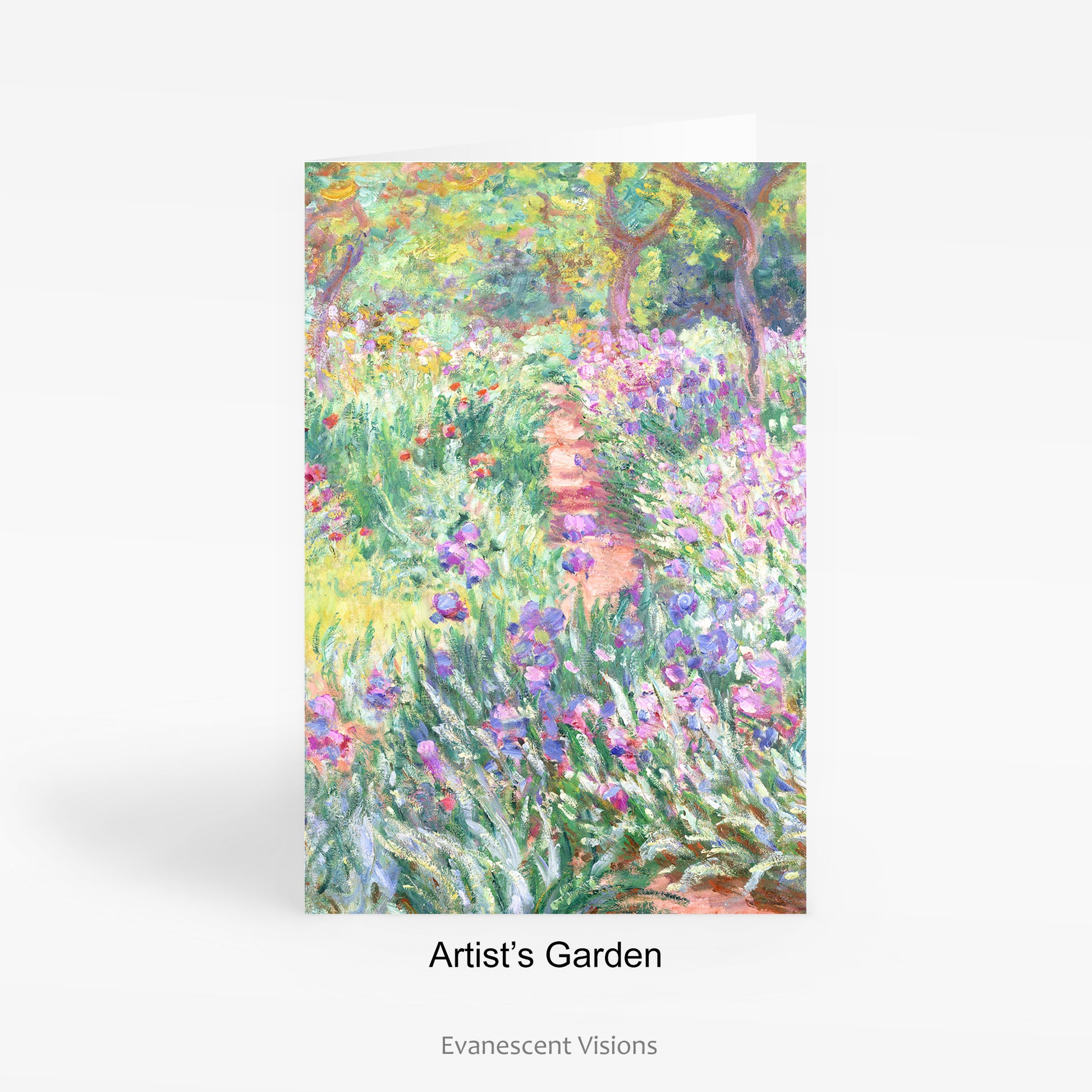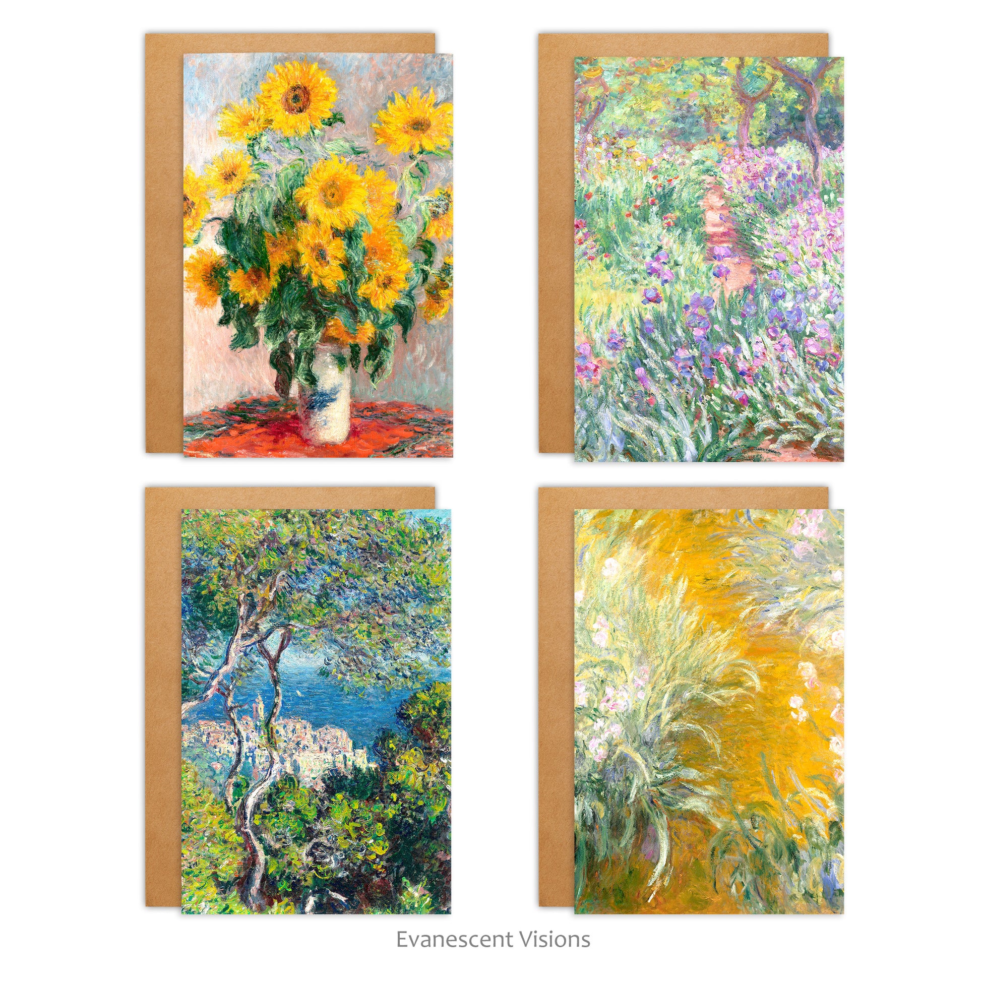 Single or set of 10 fine art cards with various floral and landscape Impressionist images by Claude Monet (1840-1926). There are four designs to choose from, 1. Artist's Garden, 2. Bordighera, 3. Path through the Irises, 4. Sunflowers.
