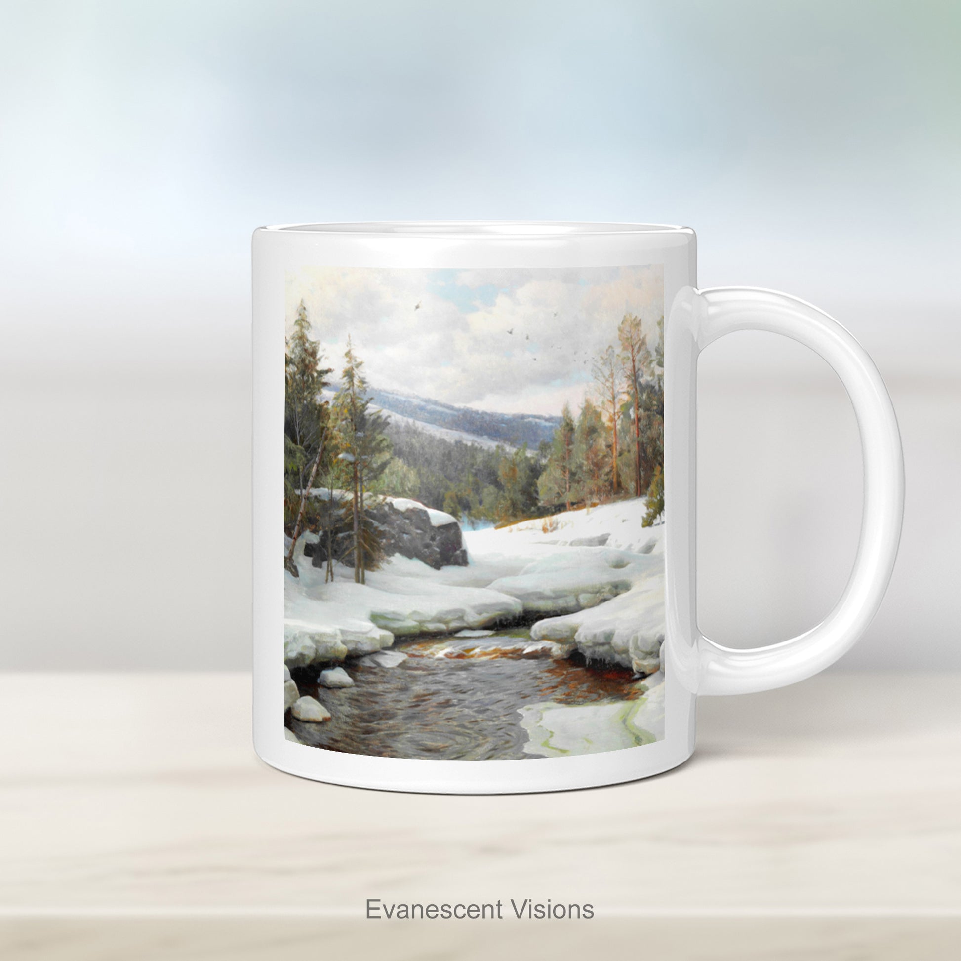 Seasonal 11oz mugs, featuring winter landscapes and snow scenes, by Danish artist, Peder Mørk Mønsted (1859-1941). Choose from four designs: