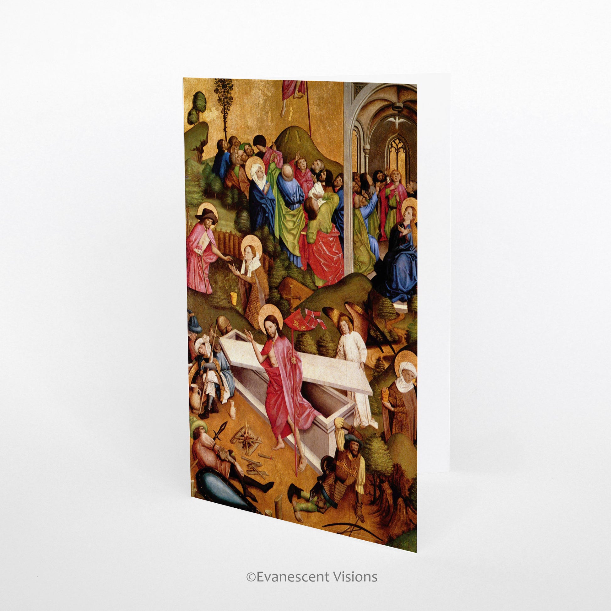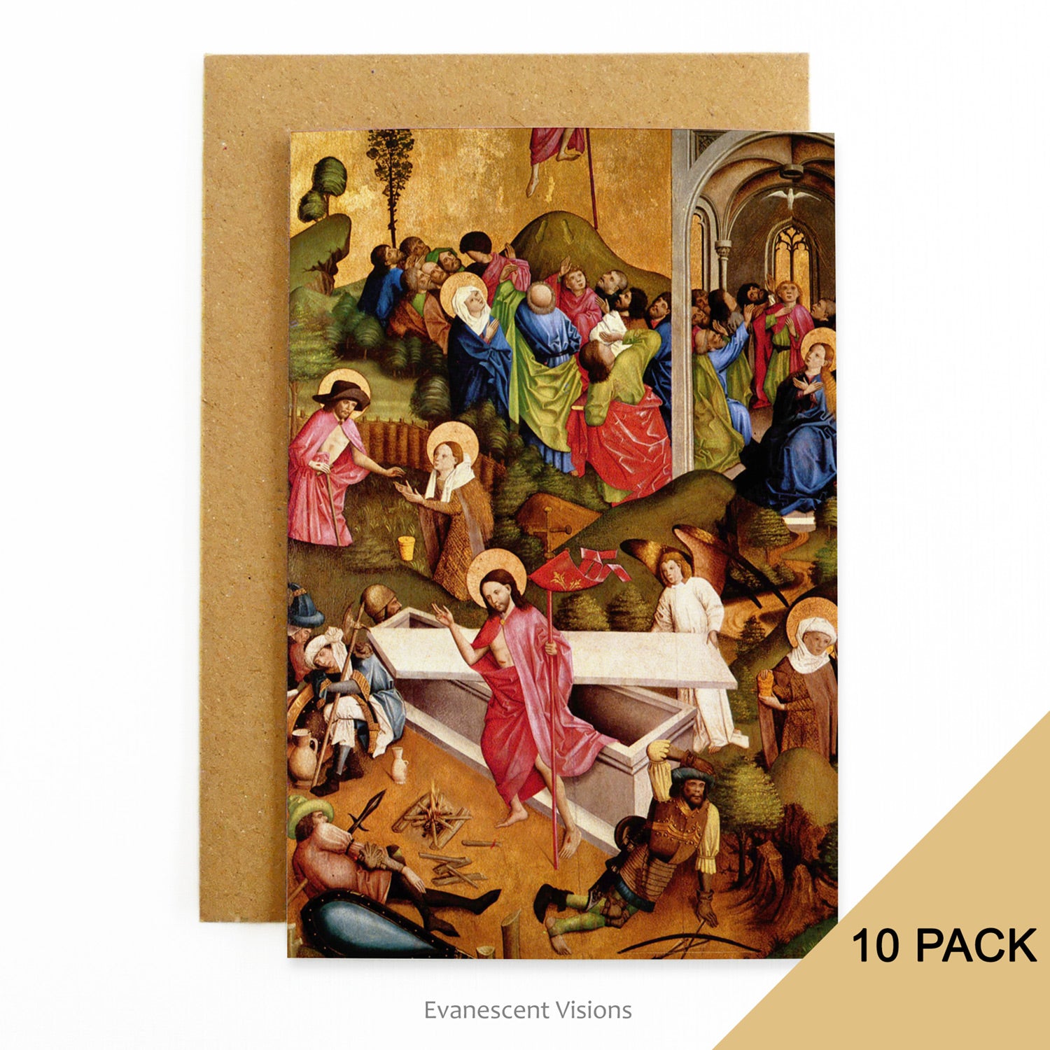 A pack of 10 traditional Easter cards, depicting the Resurrection, Ascension and Pentecostal scenes from the Bible as portrayed in the altarpiece which hangs in the German parish church in Schöppingen.  The artist's name is unknown, but he was active in the area around Munster from 1445 to 1470 and is referred to as the Master of the Schöppinger Altarpiece.