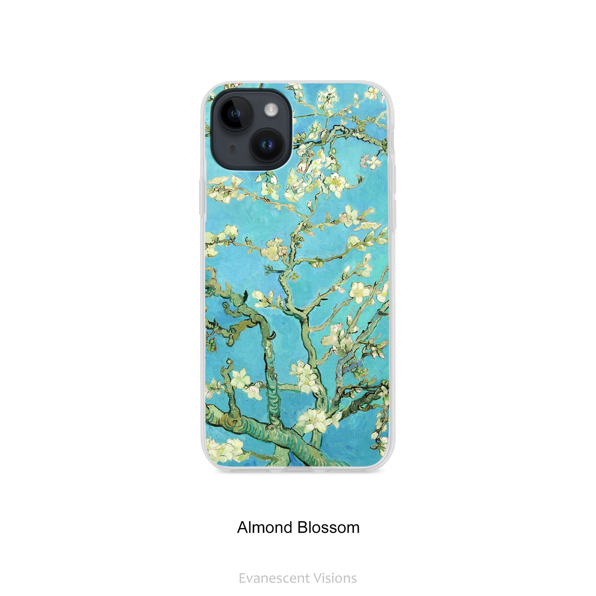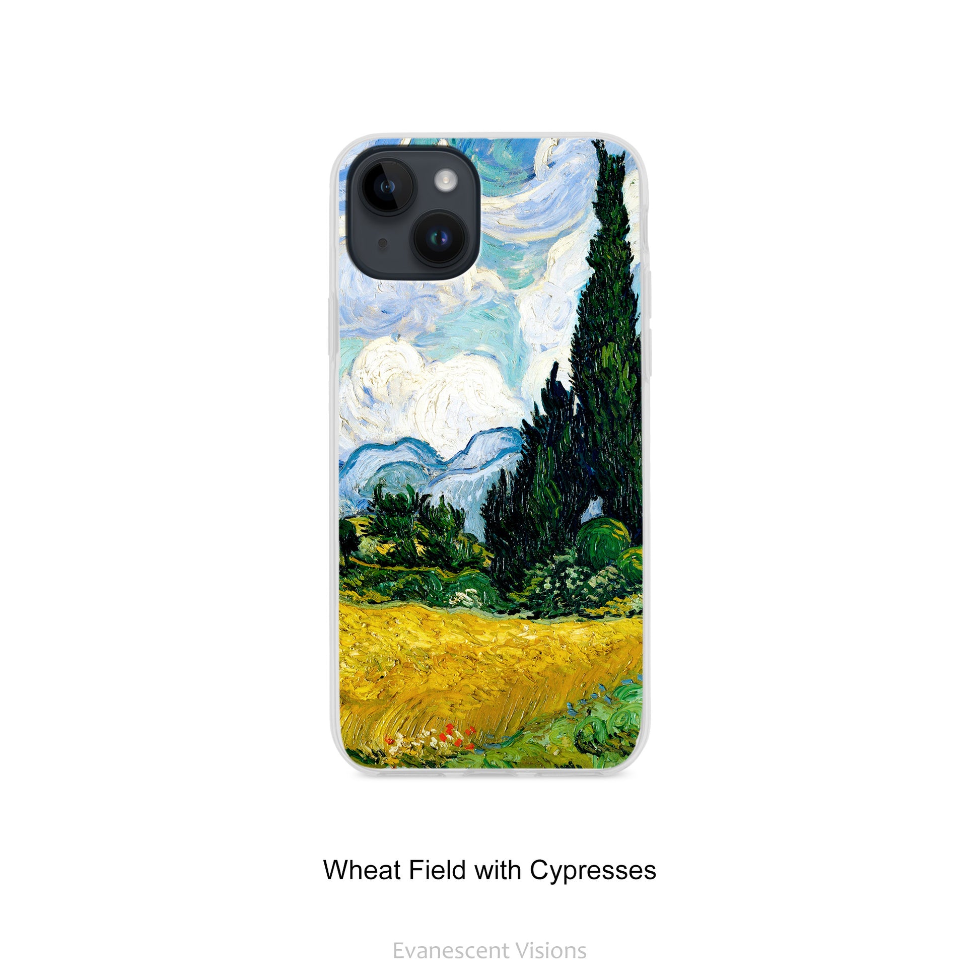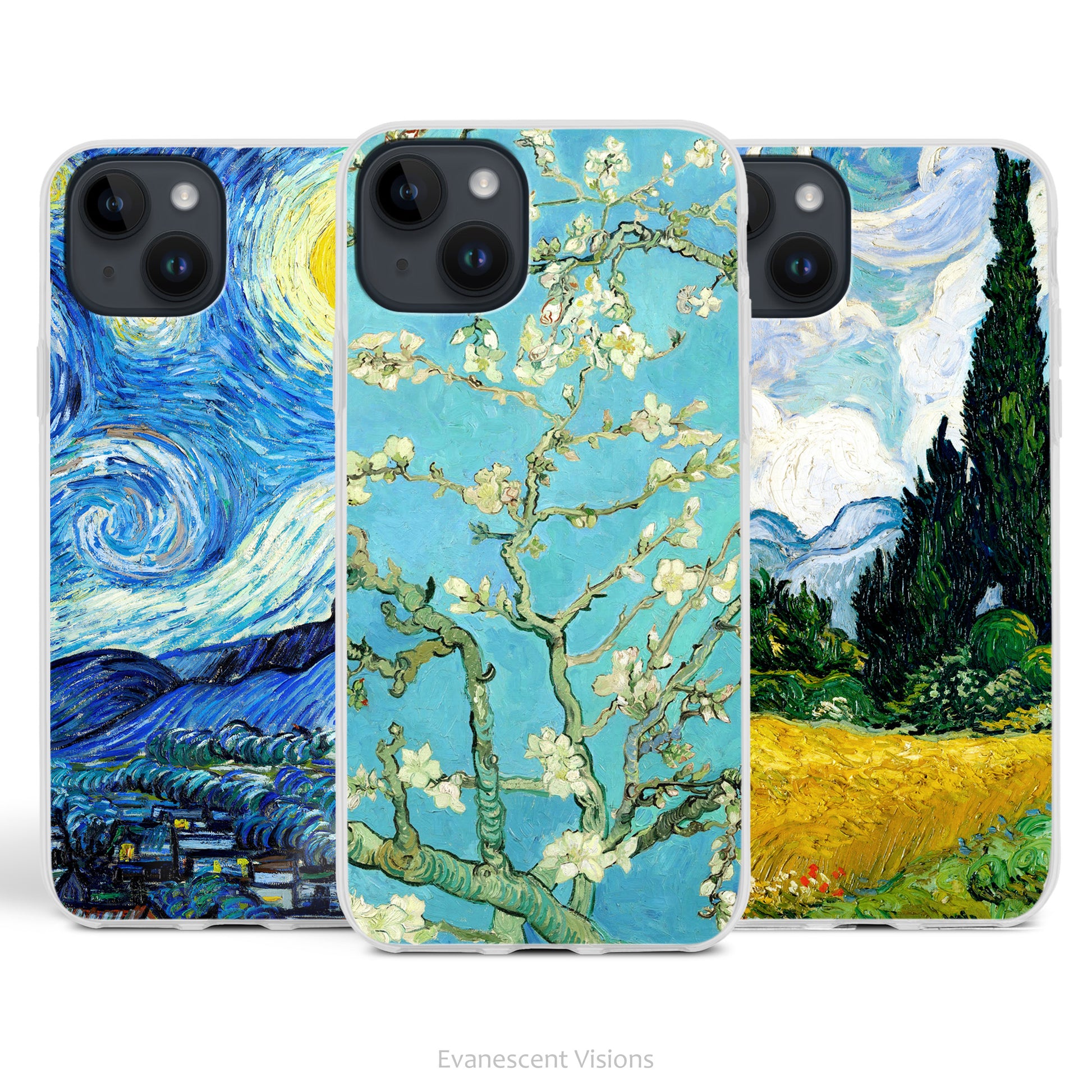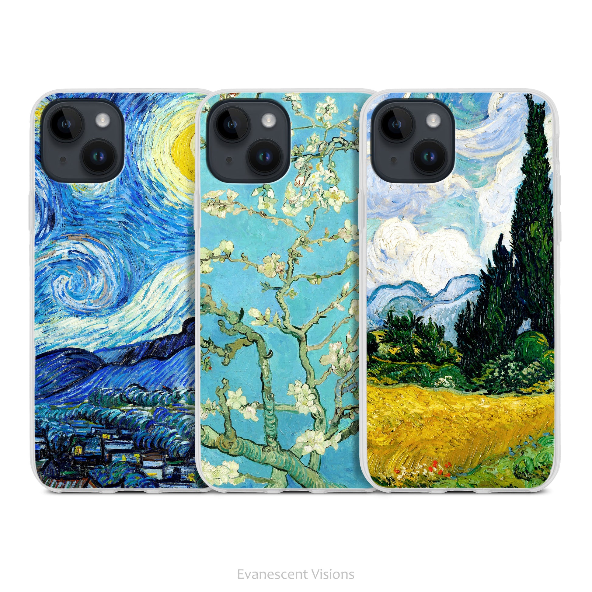 Protect your iPhone with a gel case featuring one of Vincent Van Gogh's iconic paintings. Choose from three designs, 1. Wheat Field with Cypresses, 2. Almond Blossom, 3. Starry Night.