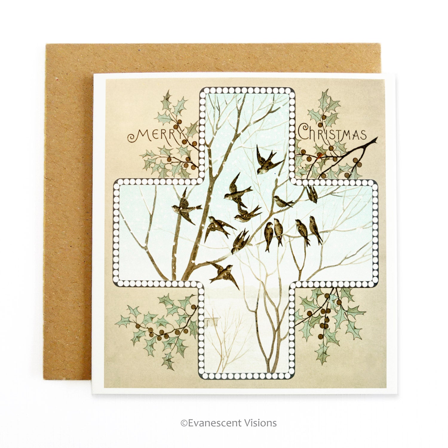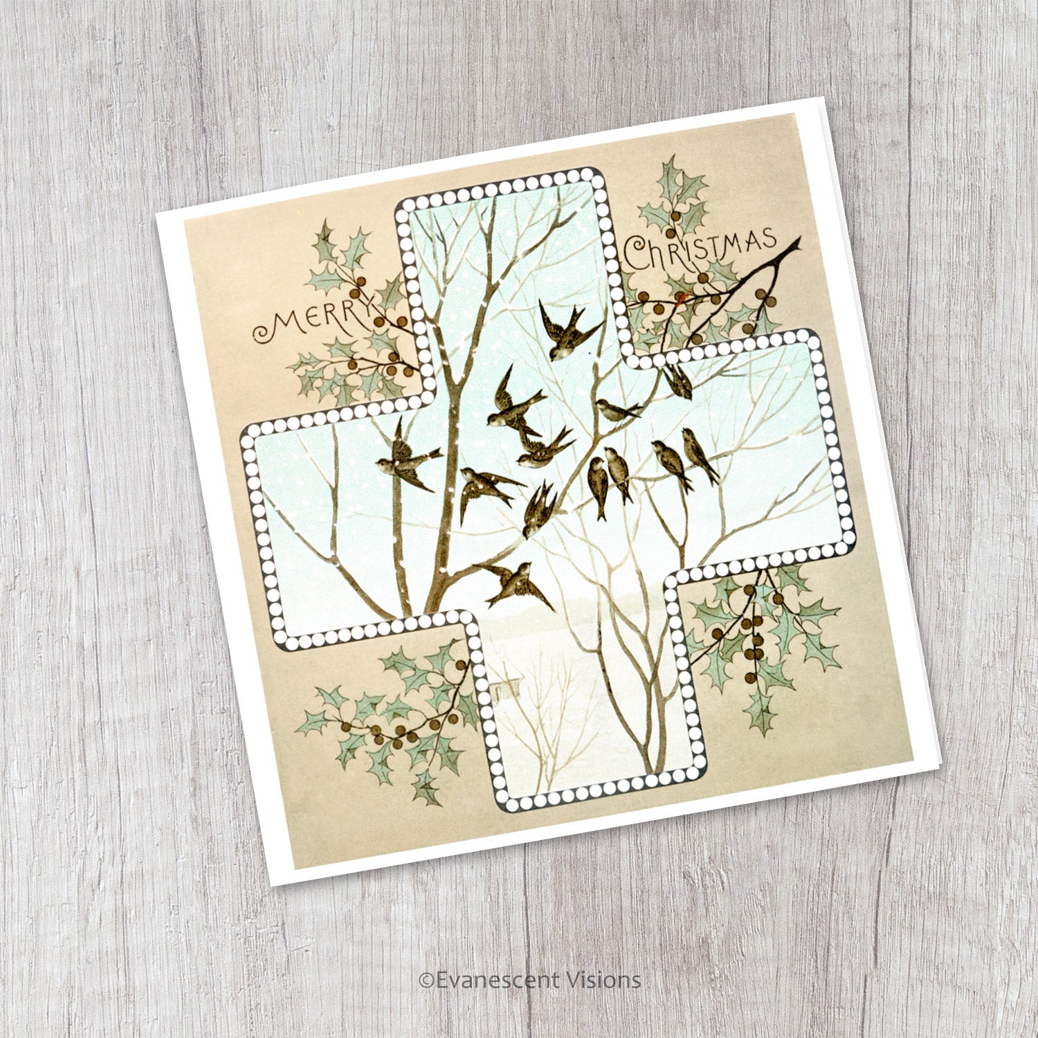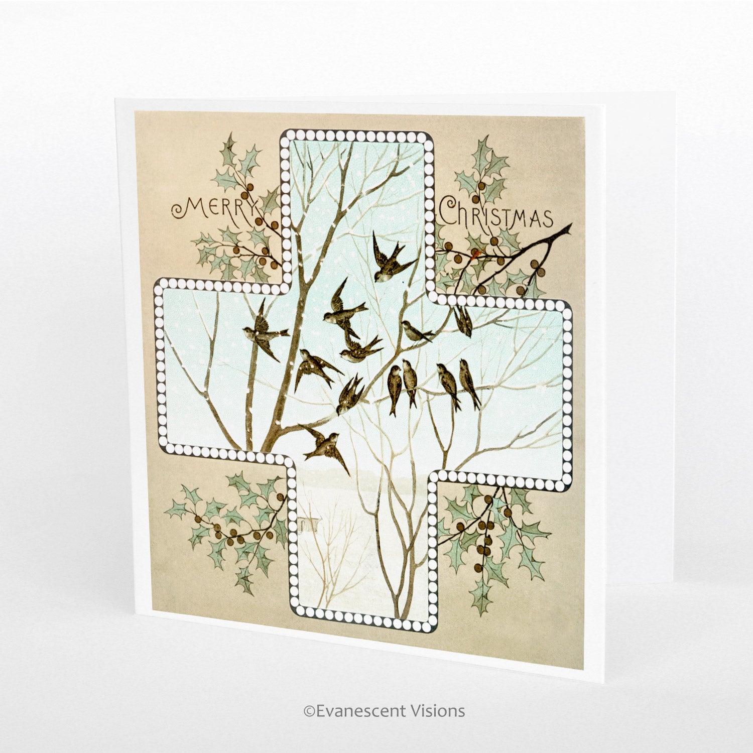 A Vintage design Christmas card which can be personalised with your own seasonal greeting or left blank inside. The design on the front depicts an open window cross shape filled with birds and winter branches, surrounded by holly and the words 'Merry Christmas'.