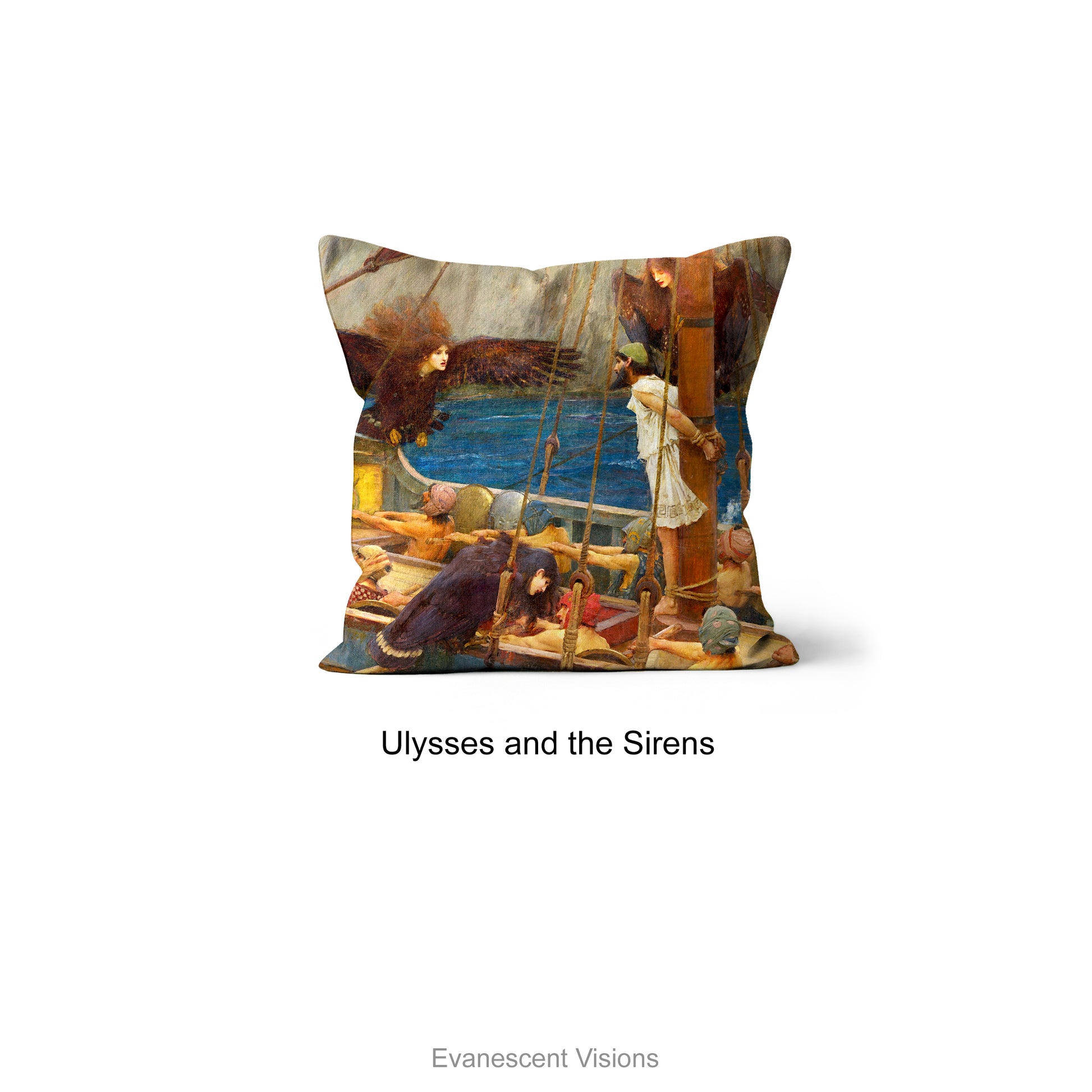 A single decorative art cushion available in two sizes, featuring paintings by John William Waterhouse (1849-1917). Choose from 'The Lady of Shalott,’ inspired by Tennyson’s poem of the same name, 'Miranda - the Tempest,’ a scene from Shakespeare’s famous play, or 'Ulysses and the Sirens,’ featuring the moment when Ulysses, desiring to hear the exquisite Siren song, yet not wanting to be vulnerable to the magic which lures sailors to their doom, has made his crew tie him to the mast and plug their own ears.