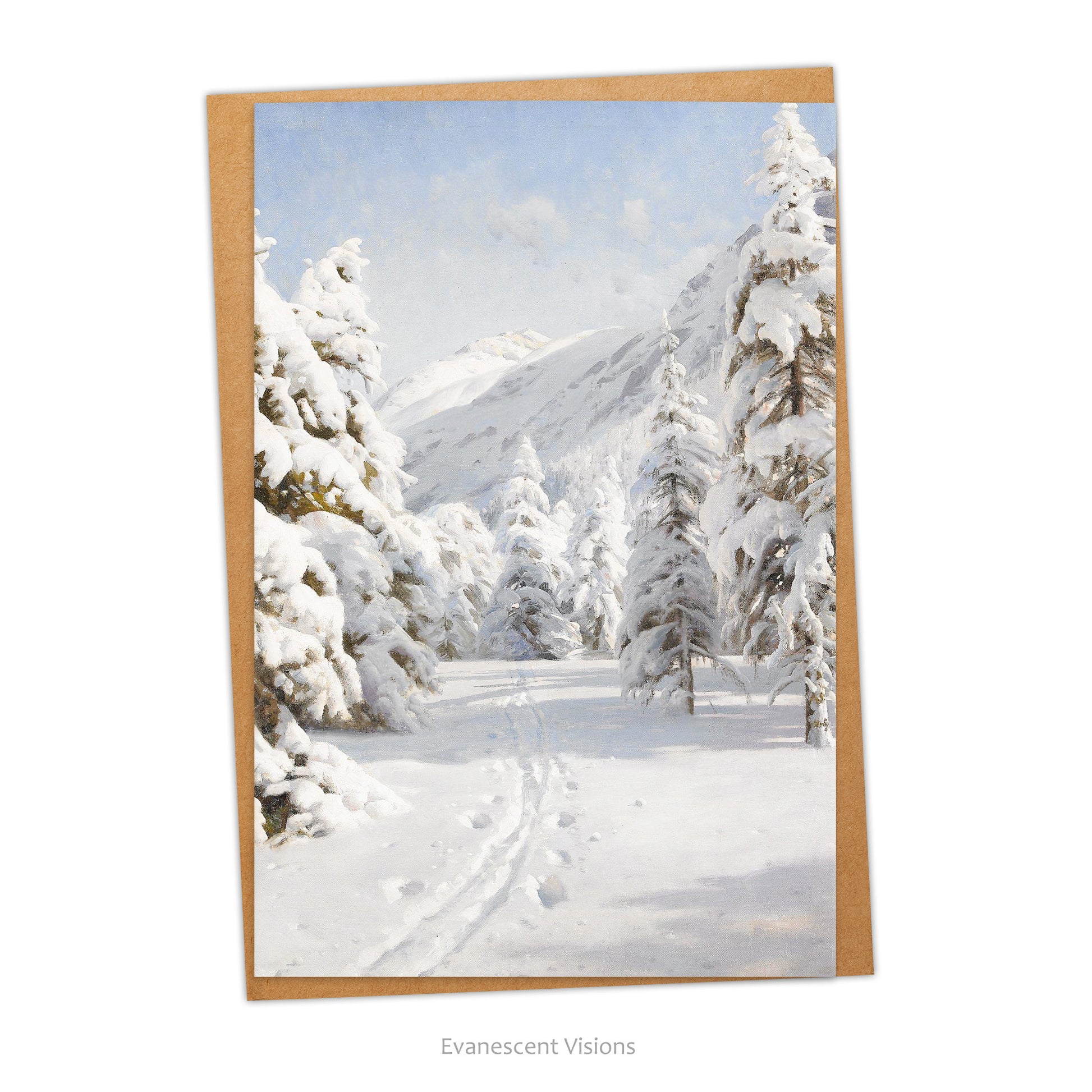A fine art traditional winter painting card perfect for Christmas or other winter holiday seasonal greetings. The design features a snowy landscape from the painting 'Winter Landscape' by Danish artist, Peder Mørk Mønsted (1859-1941).